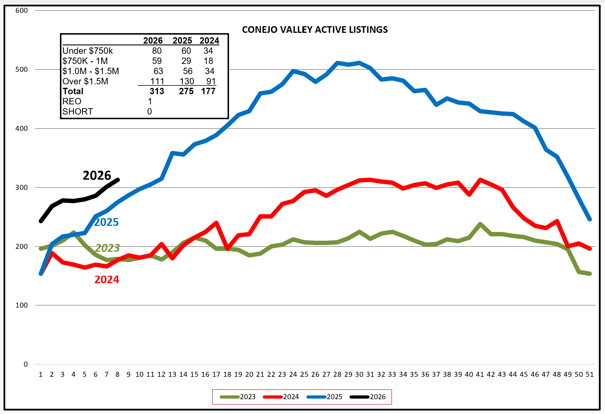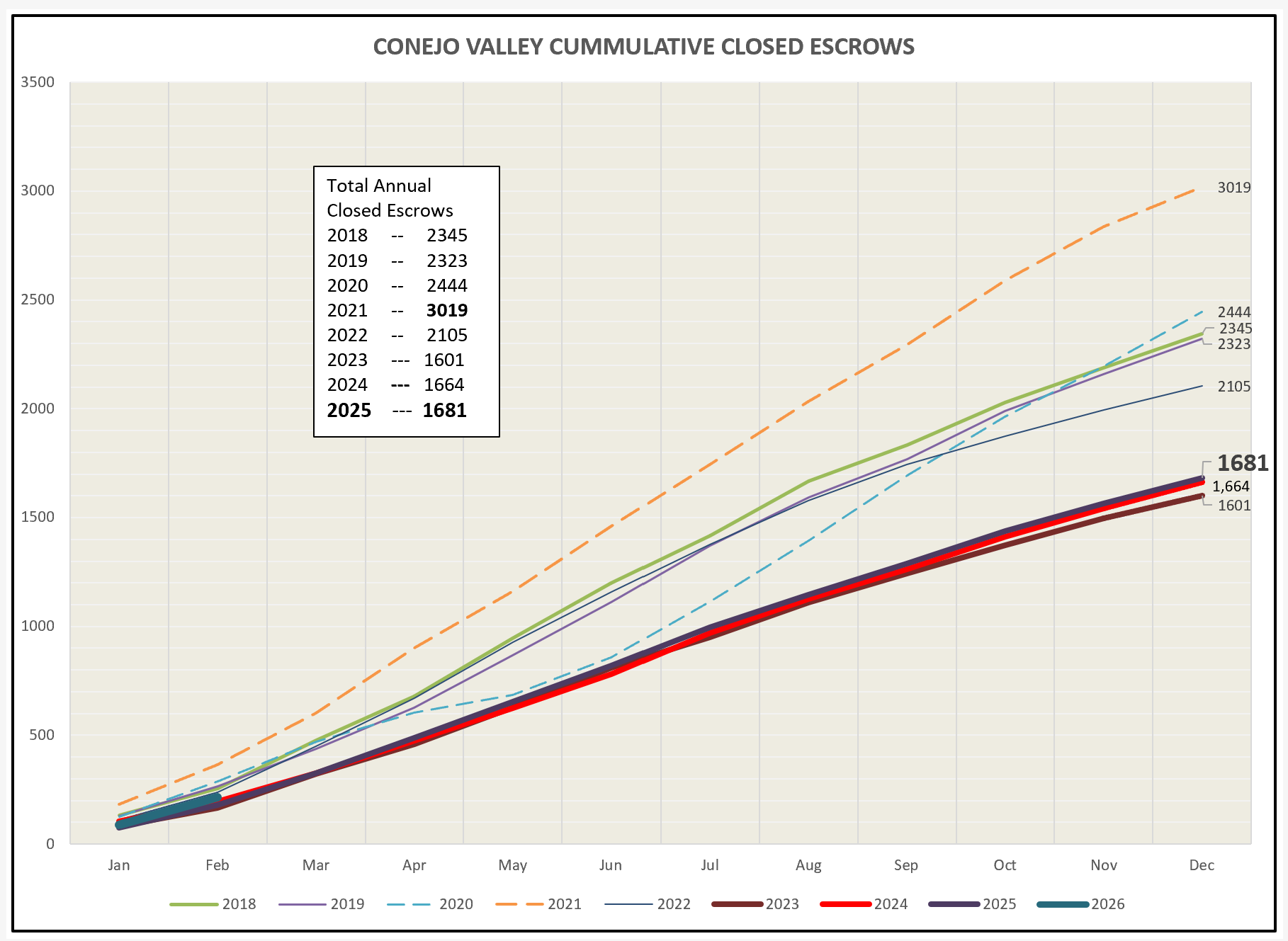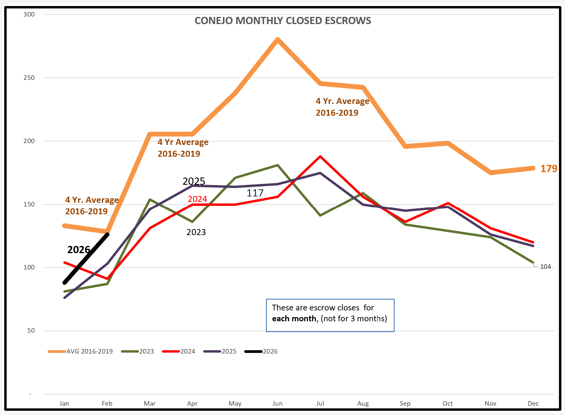 For Conejo, sales are starting out comparable to the past three years. We hope this foretells a strong market, but it is too early to tell. 2023 , 2024 , and 2025 compared closely to one another. Next month we will get a better read on how 2026 compares. A sneak peak into the future tells me we are still following the levels of those three years.