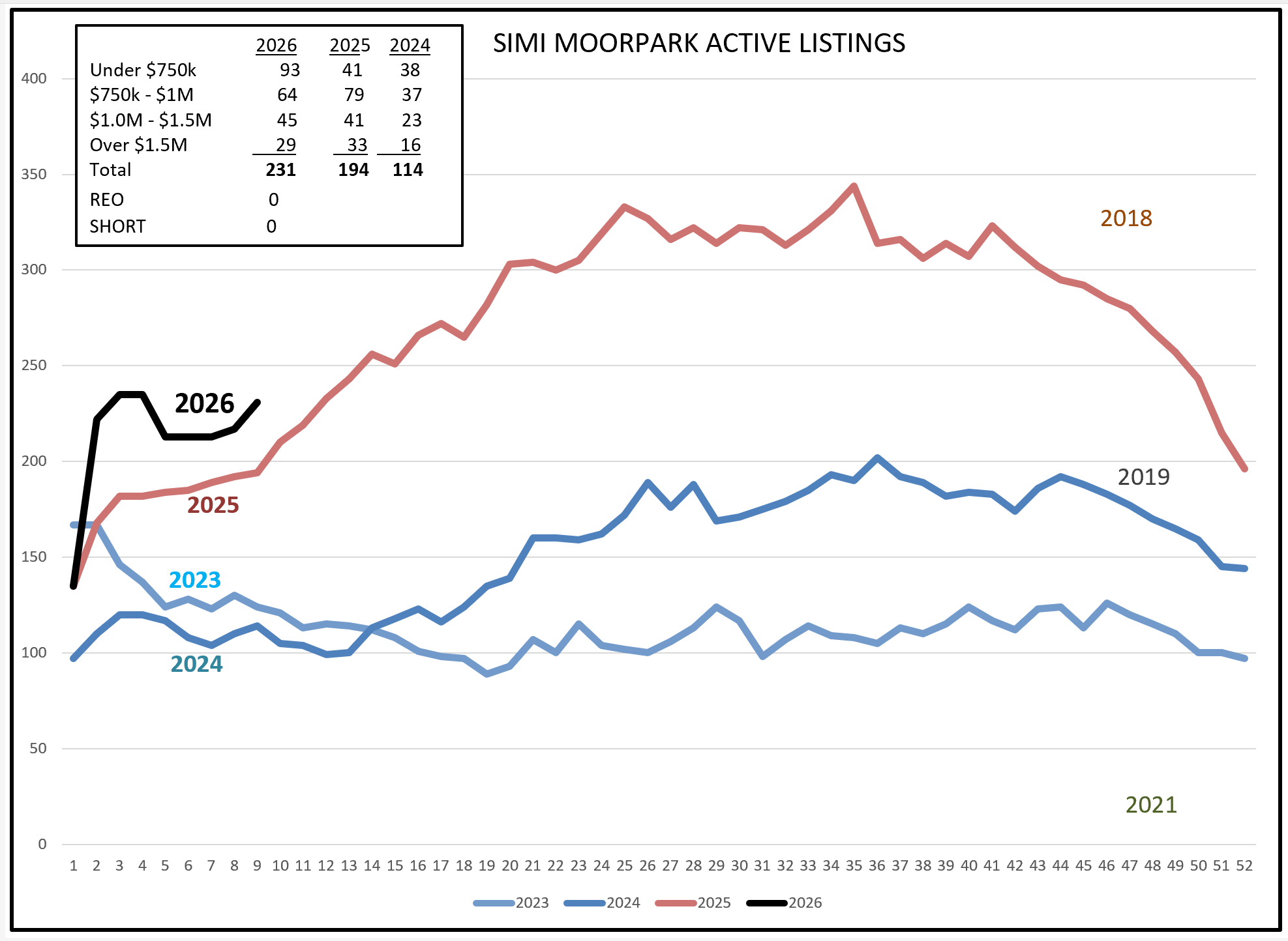 For Simi Valley/Moorpark, the same is true. In the Covid years, inventory was as low as 100, and sales were impacted. We now have a decent amount of listing inventory.
